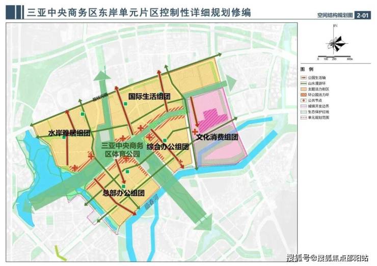 三亚中央商务区东岸单元——商业商务、文旅消费、居住生活综合服务功能• 一芯:以三亚中央公园为城市绿芯• 四廊:延续现有水绿脉络,打通区域十字山海绿廊,串联城市区域板块• 多组团:总部办公组团、综合办公组团、文化旅游组团、国际生活组团和水岸雅居组团