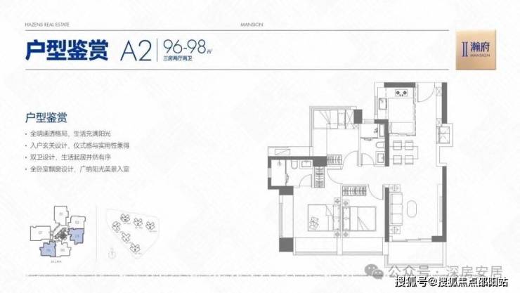 96-98㎡3房2厅2卫03/05/06(A2/A3)户型,设计的是经典竖厅三开间朝南格局,客厅3.5米开间,LDKB一体化,S墙设计预留冰箱卡槽位,主卧+1个次卧双飘窗。
