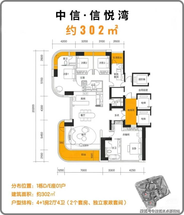 302㎡(D/E栋户型): 四房两厅四卫+保姆间,是整个项目的“主力担当”。值得注意的是,20层以上的楼层因可越过歌剧院看无遮挡海景,价格有显著跃升。同时,同一楼层中,视野更佳的02户型会比01户型贵出约300万。这生动诠释了,在顶豪世界里,每一寸视野都明码标价。