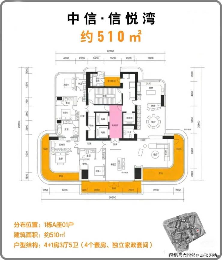 项目B栋370㎡户型,是整个项目地段和朝向最好的产品,主打东南向看中心河跟永久无遮挡海景