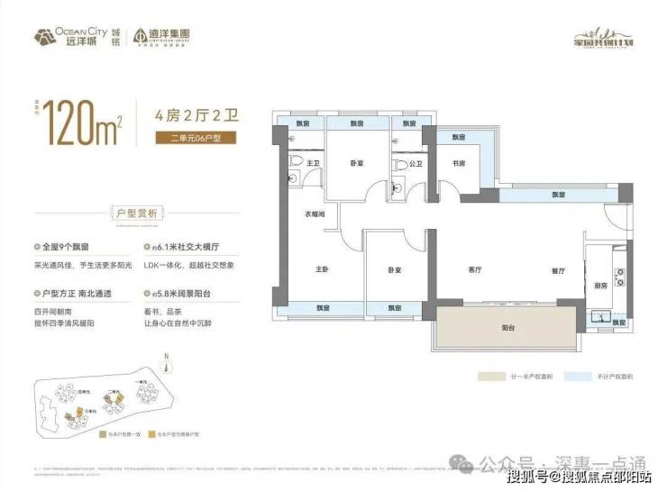 120㎡的4房2厅2卫,设计的是横厅南北通透格局,进门独立玄关,客餐厅6.1米开间,LDKB一体化,四开间朝南,主卧双飘窗通透设计,全屋9面凸窗,L型厨房,卫生间干湿分离,得房率约76.2%(不含赠送),客餐厅出5.8米长的阳台主朝西南或东南向。