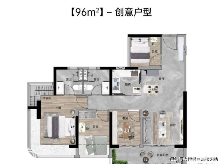 【96㎡四房两厅两卫】:西南向,使用率100%,约5.7米面宽瞰山阳台,主卧270°主卧弧形玻璃幕窗。