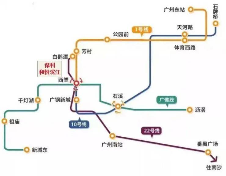 广州地铁1号线、广佛线、22号线(首段通车),10号线(建设中)四地铁交汇,通达全城,主城干道花地大道、环城高速等多维通勤打造30分钟主城生活圈。