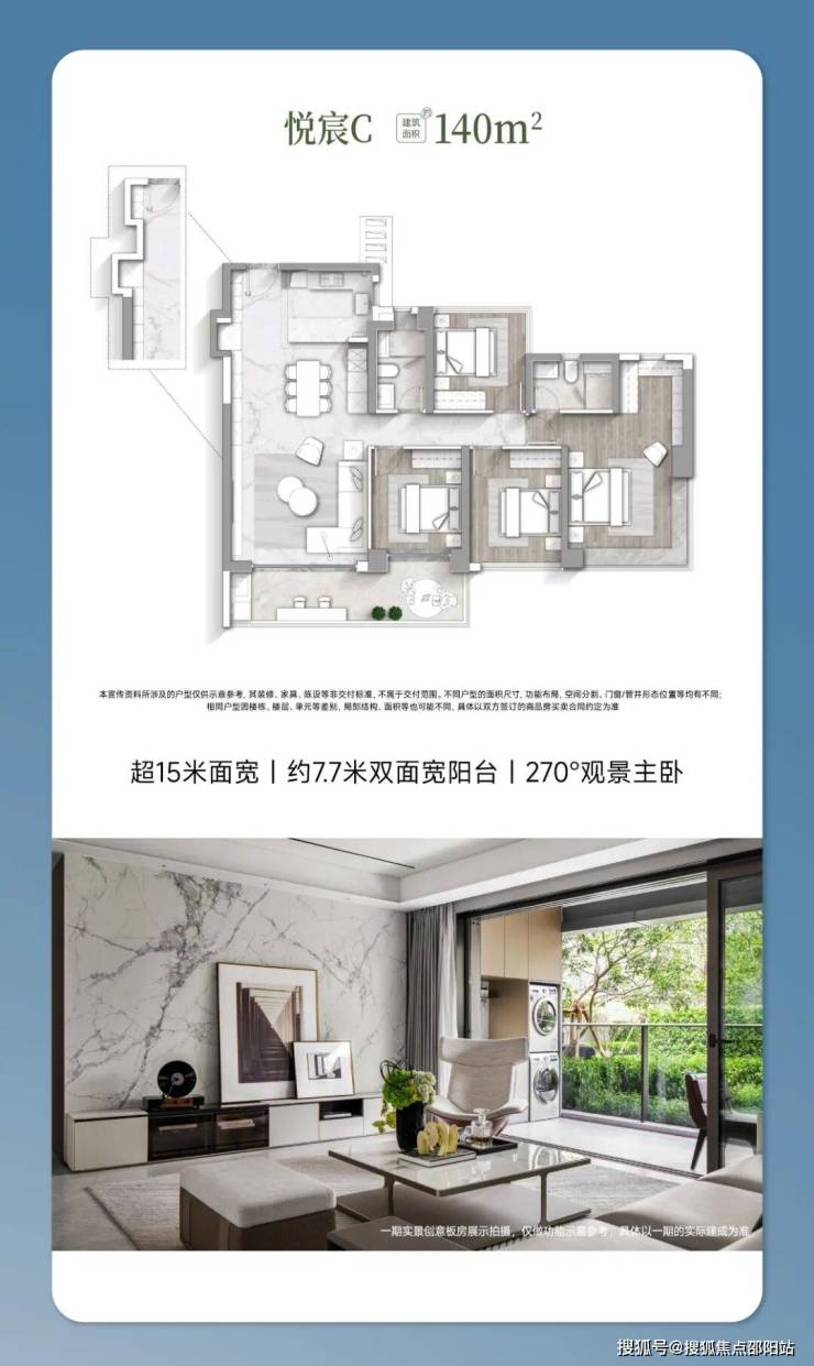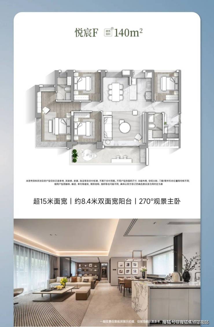 悦宸系列:约140㎡户型,南北对流,三面窗设计,270°全景采光,超大阳台连接客厅与卧室,尽显奢华与尊贵。