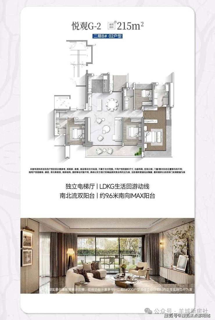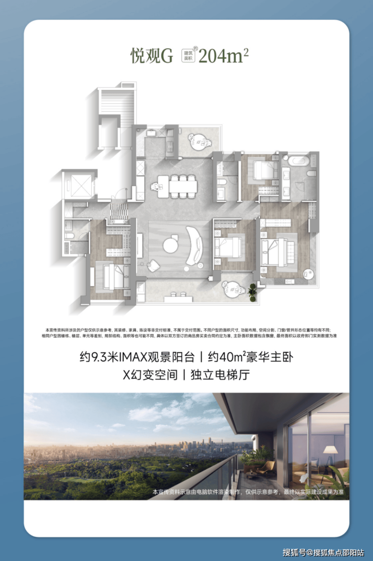 悦观G户型:约204㎡的超大空间,LDKG一体化布局,同享约9.3米南向IMAX观景阳台,豪华主卧套房,独立电梯厅,尊享私密与尊崇。