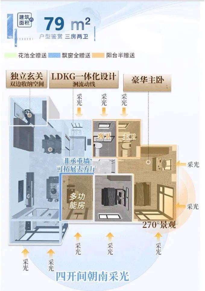 新规产品,将空间发挥极致,建面约77-91㎡三四房,全双卫设计,打造南北通透低密精奢小户,真正做到高赠送高使用