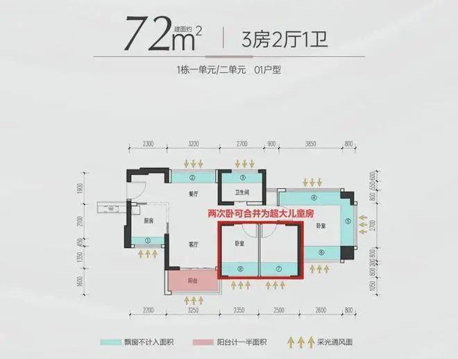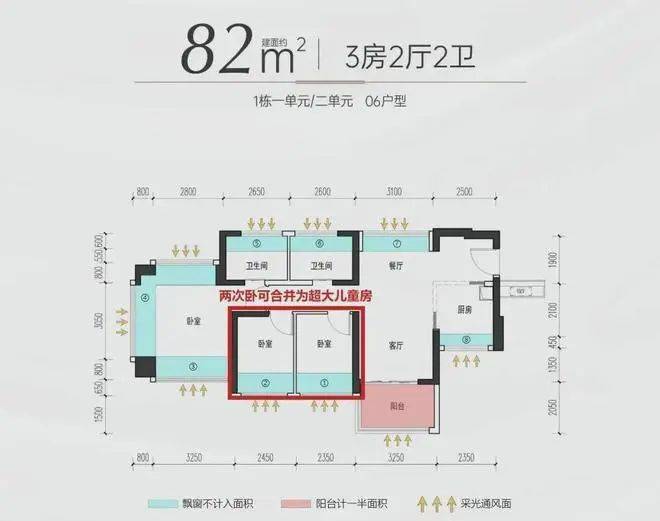 根据家庭实际需要,两个次卧可合并为一个超大儿童房,让带娃看护更轻松。