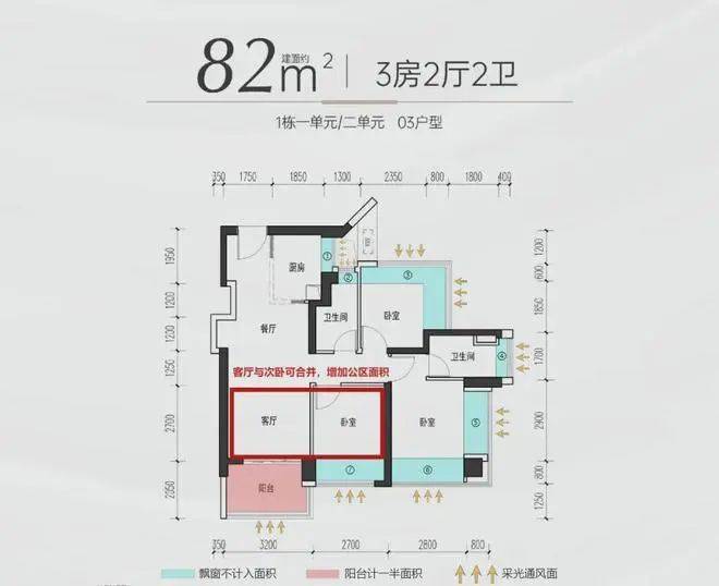 与市面同面积产品相比,该户型采用客餐厨+阳台一体化设计,双向对流通风采光;主卧还有270°环幕飘窗,带来极佳视野景观。