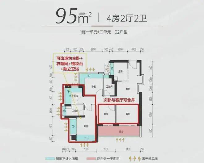 并且,这两个户型空间可根据需求灵动改变。如可将次卧与客厅合并,增加公区空间;将主卧与多功能房、卫生间合并,改造为带衣帽间、梳妆台与独立卫浴的豪华套房,提升居住私密性和舒适度等。