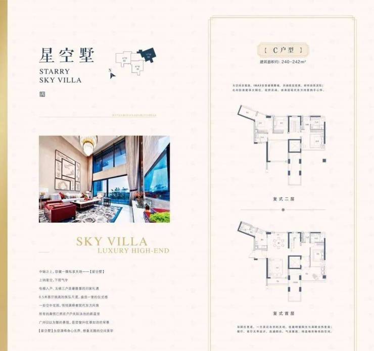 约2.2低容积率 打造广州低密高端墅区佳兆业天墅以建筑密度约22%,低至2.2的容积率,打造约305-455m2的低密墅居。一般住宅层高普遍约为2.8-3米,而天墅全盘整体抬高7-10米,相当于正常住宅的7楼高度,山景与园景一览无余。