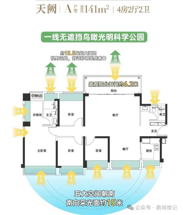 - 141㎡的4房2厅2卫,设计的是横厅南北通透格局,进门入户玄关,超宽客厅6.2米的开间,五开间朝南,4个卧室分别做到了3.6米/3米/2.8米/2.7米的宽度,主卧大套房设计,U型厨房,公卫三段式分离设计,得房率约:81.4%(不含赠送),阳台主朝东北向,看科学公园景观。