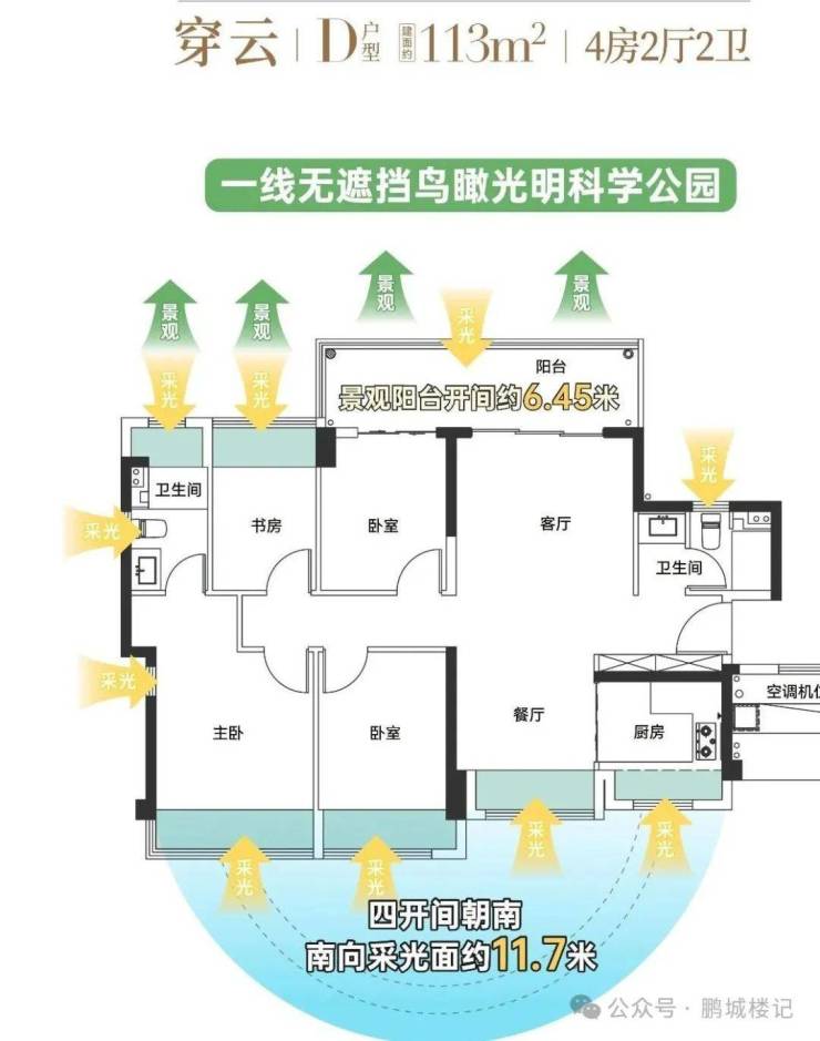- 113㎡的4房2厅2卫,设计的是竖厅南北通透格局,进门入户玄关,客厅连接次卧出6.45米长的大阳台,四开间朝南,4个卧室分别做到了3.4米/2.7米/2.7米/2.3米的宽度,主卧大套房设计,U型厨房,公卫三段式分离设计,得房率约:81.39%(不含赠送),阳台主朝东北向,看科学公园景观。