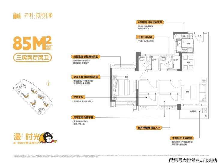 建面85㎡的户型,不仅有独立主卫给予业主更有仪式感的生活,而且还有可以有双飘窗做加持。