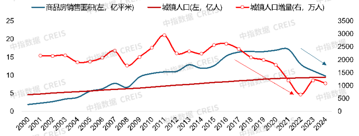 伴随着我国城镇人口的高速增长,房地产市场也经历了持续20多年的快速扩张阶段,但2017年以后,我国总人口及城镇人口增长速度开始逐年放缓,直至2022年总人口规模出现下降,每年城镇人口增量降至1200万人以下,全国商品房销售面积也在2021年见顶后逐步回落。