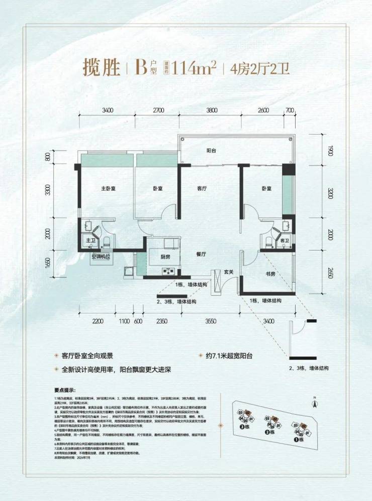 114㎡的4房2厅2卫,设计的是竖厅双龙抱珠格局,进门入户玄关,客厅3.8米的开间,LDKB一体化设计,4个卧室分别做到了3.4米/2.7米/2.6米/2.65米的宽度,客厅连接次卧出7米长的观景大阳台,U型厨房,得房率约:81.39%(不含赠送),东北朝向看科学公园。