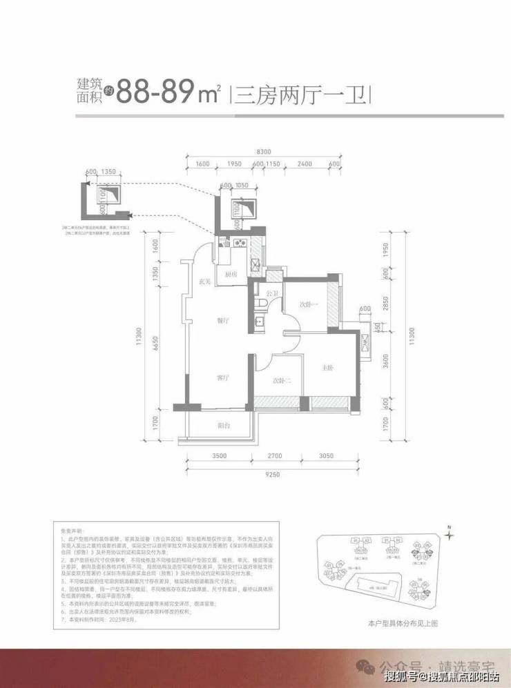 88㎡的3房2厅2卫,设计的经典竖厅格局,客厅3.4米开间,LDKB一体化设计,S墙设计预留冰箱卡槽位,3个卧室分别做到了3.55米/2.6米/2.4米的宽度,U型厨房,公卫三段式分离设计,得房率约:95%(包含赠送),阳台进深1.8米,有西南或东南朝向。