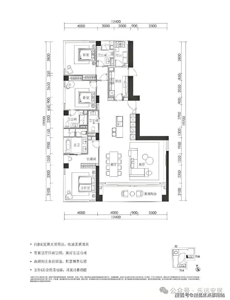 280㎡三房两厅四卫:位于1栋三、四单元24-32层,为05、08户型。拥有超8米超宽幕开间,厅出阳台可直面海景。采用三套房设计,主卧配备L形全景落地窗,占据270°最佳观海位。