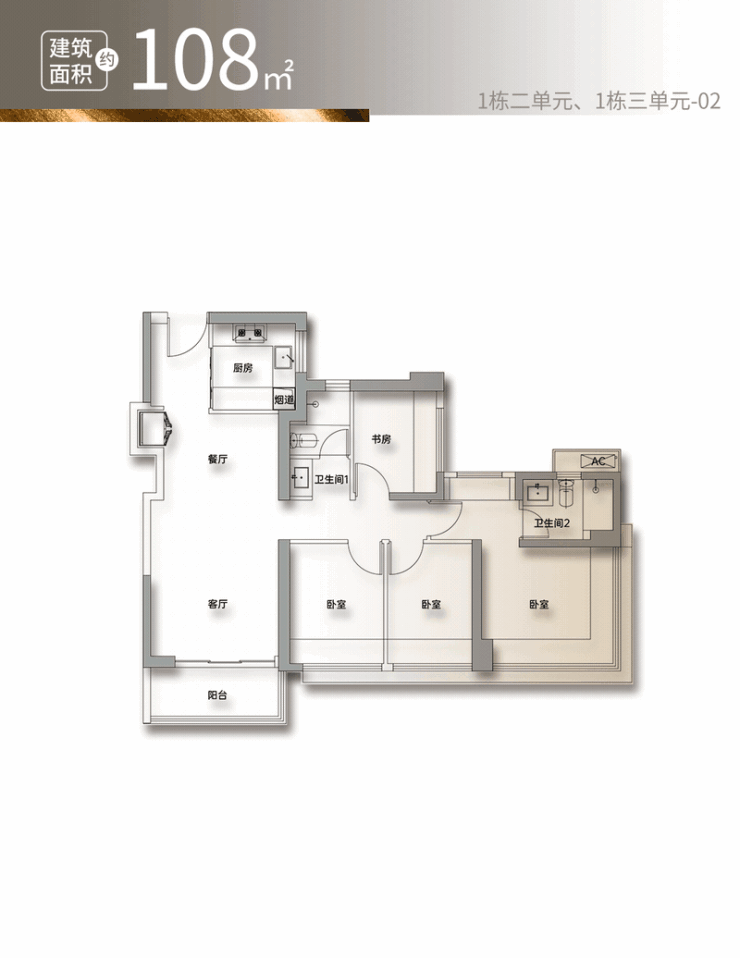 建面约108㎡4房2卫,是陪伴三代同堂/多孩家庭成长的户型。