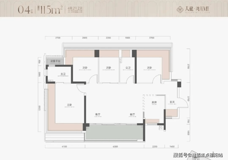 横厅设计,进门处玄关宽敞,客餐厅跟厨房一体化,115平户型的升级版,客厅旁边多一个次卧房间,主卧套房设计,L型拐角飘窗双面采光,兼顾实用与美观。