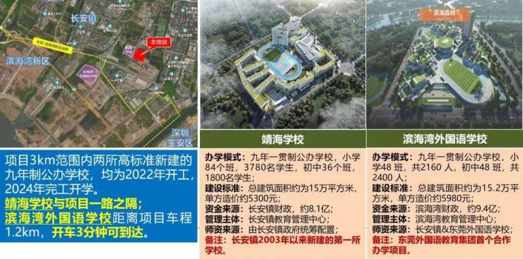 三大菁英教育:九年一贯制靖海学校(2022年10月动工)、东莞滨海湾外国语学校(预计2024年9月开学)、大湾区大学滨海湾校区(预计2023年动工);