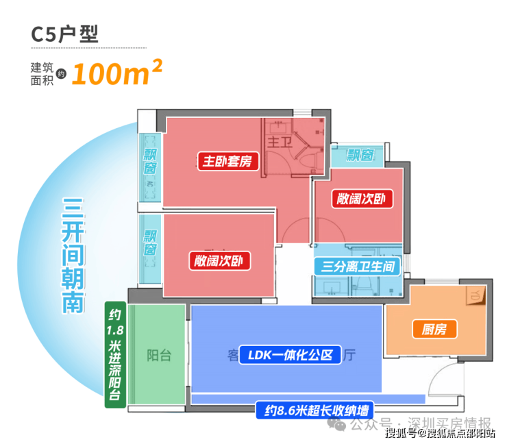 约100㎡的三房户型,三开间全部朝南,通风采光无死角,尽享阳光的宠溺。