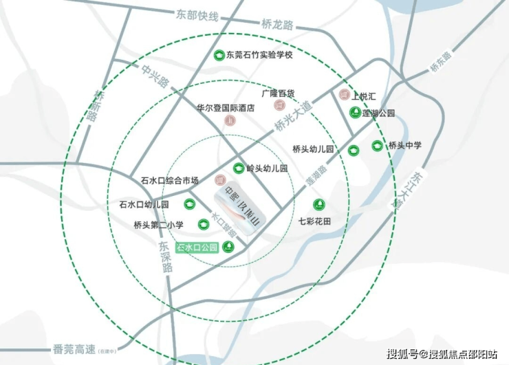 ◎三轨道:桥头坐拥R3、R17、惠州5号线延长线(规划中),三轨交融,串联东莞三大核心发展极,纵横莞惠两地,其中项目距离R3线大东路(规划)仅3公里。