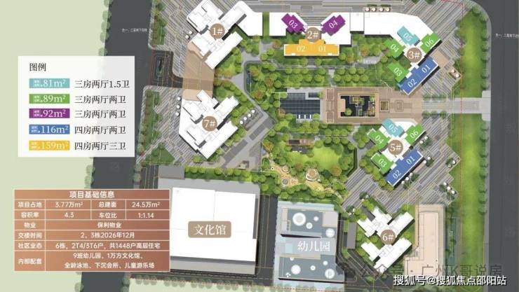 保利招商华发中央公馆采用了围合式设计,6栋47层高塔楼设计,小区自身配建有文化体育场馆和幼儿园,除了2#楼王是两梯四户,其余均为三梯六户,8#是5层高的文化馆,9#是配建3层高的幼儿园。
