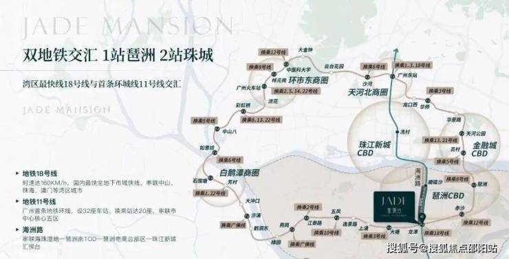 2、交通十分便捷:是地铁 11 号线和 18 号线双轨交汇处上盖的 TOD 项目,18 号线可快速到达广州南北各地,11 号线为环线,可便捷连接市内各重要区域,周边还有主干道四纵三横贯穿,15 分钟内可达琶洲、珠江新城等核心 CBD。