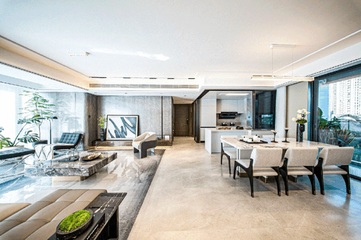 由于客厅本身尺度足够阔绰,加上连通超6.4米南向阳台,如此设计,拥有收纳功能的同时,空间的尺度感也没有被影响,反而倍感奢阔。