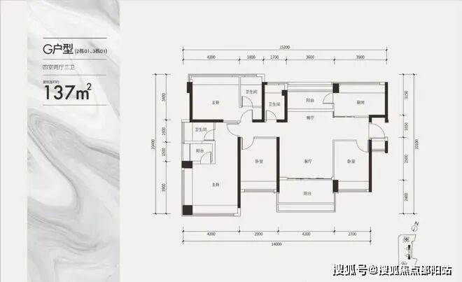 建面约137㎡双套间户型(四房三卫)