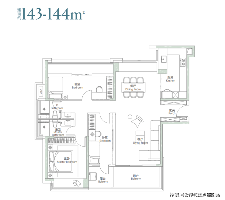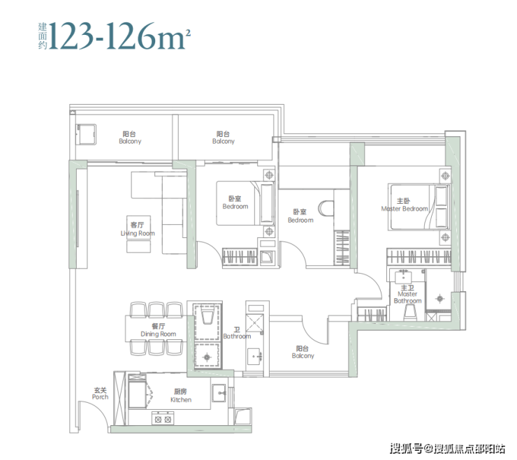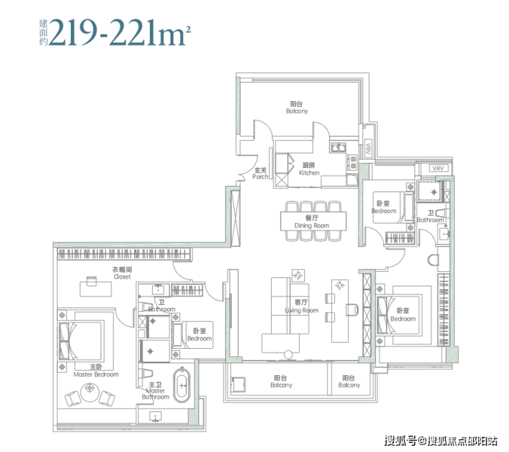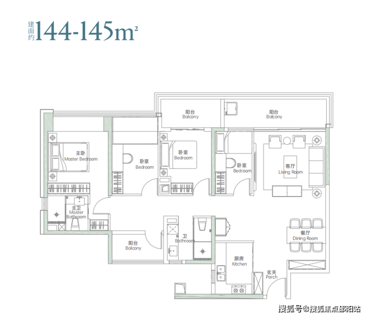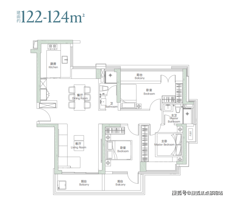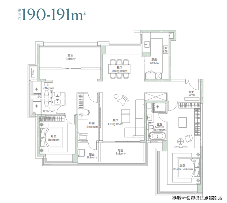 竖厅户型,客餐厅一体出阳台,客厅旁边“阳台”实际可以做一个房间,主卧套房设计,也可以做成5房。
