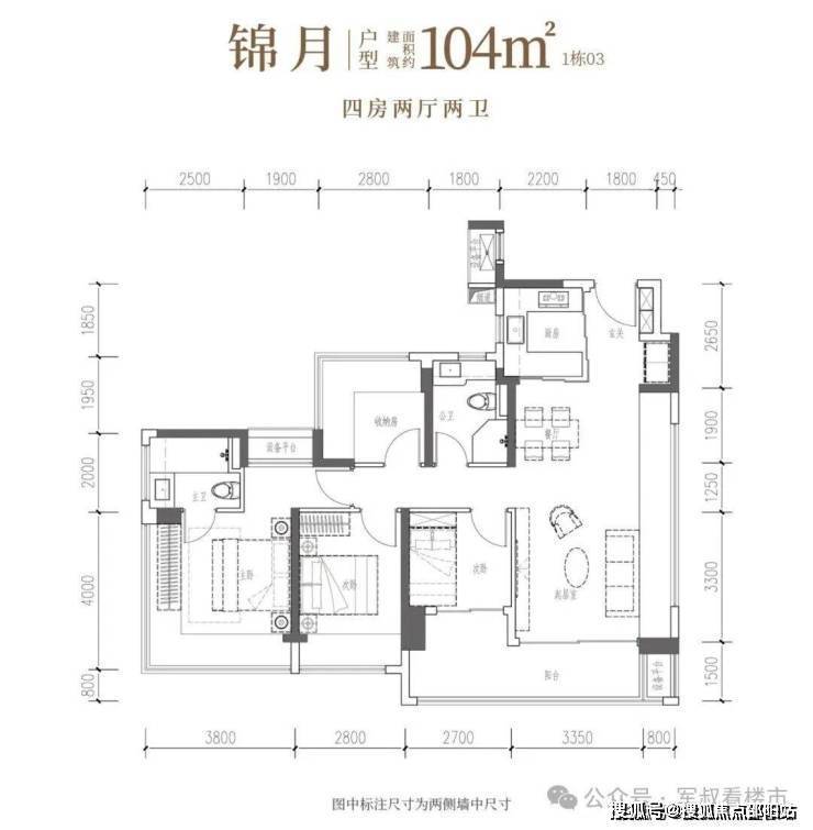 以全明格局联动LDKB一体化方厅与创新S墙巧思,更融入270°环幕主卧,将生活奢享提升至全新境界。• 锦月·建面约104㎡4房2厅2卫:南向四开间,6米阳台引景入室,自此生活融于风景
