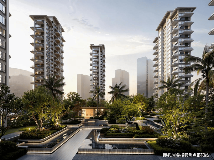 项目园林规划建设约300㎡水院、约600㎡镜面水景、约2000㎡水岸会客厅等景观及休闲空间,融入了镬耳屋、满洲窗棂等岭南元素。