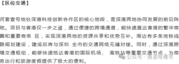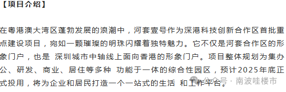 •「产业资源」:周边汇聚了众多高端产业和创新资源,有各类科研机构和企 业总部,还吸引了大量的高端人才和创新团队。目前深圳园区实质推进和落地的高端科创项 目超160个。