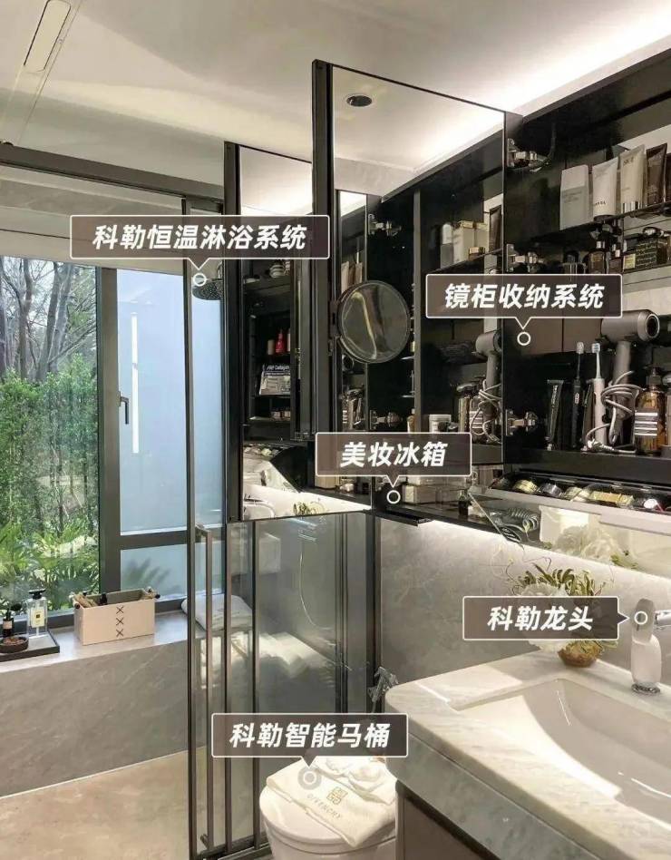 视线转到主套卫,从智能马桶到洗手盆、恒温花洒,全线来自国际一线品牌科勒,连片式的镜柜提前做了功能分区,更匹配改善家庭的收纳需求,甚至考虑到了女主人各种面膜化妆品的储存需求,准备了独立的美妆冰箱!