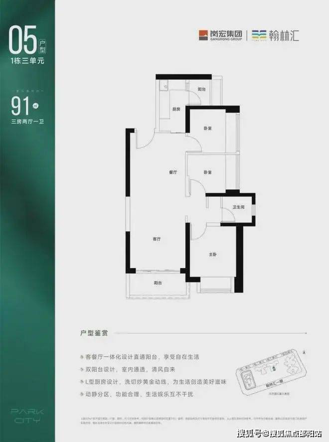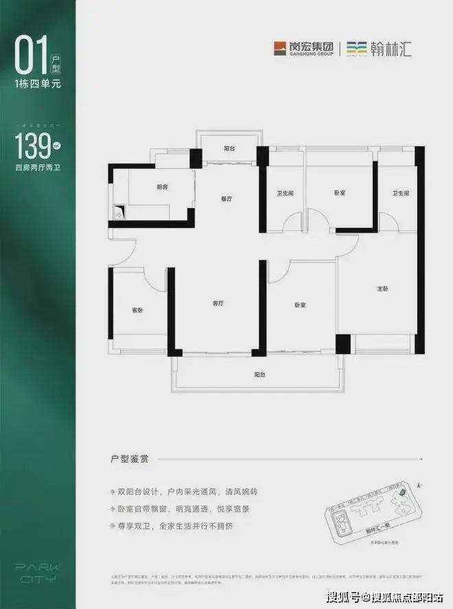 竖厅南北通透格局,入户设有玄关,LDKB一体化设计。双阳台配置,四个开间朝南,客厅与次卧相连的超大阳台,U型厨房,卫生间干湿分离。得房率约71%(不含赠送部分),主要阳台朝东南向。