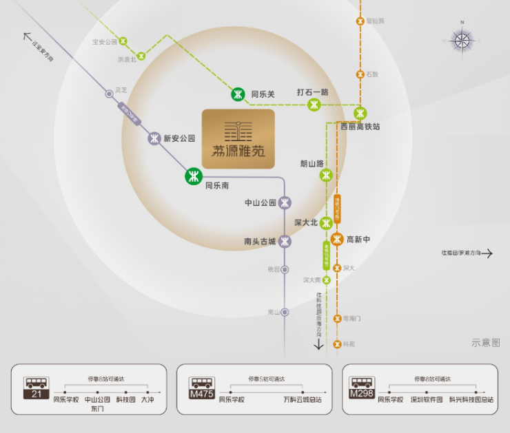 15号线(建设中)同乐关站(直线约1.5km),2站到西丽高铁站,贯穿前海、后海、南山、宝安等重要片区,环经济发展核心区域。