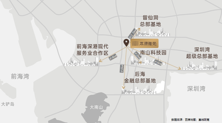 前海深港合作区(西南向约4km):定位国家战略性门户枢纽,未来将打造成世界级城市新中心,规划就业人口约65万人,居住人口15万人。