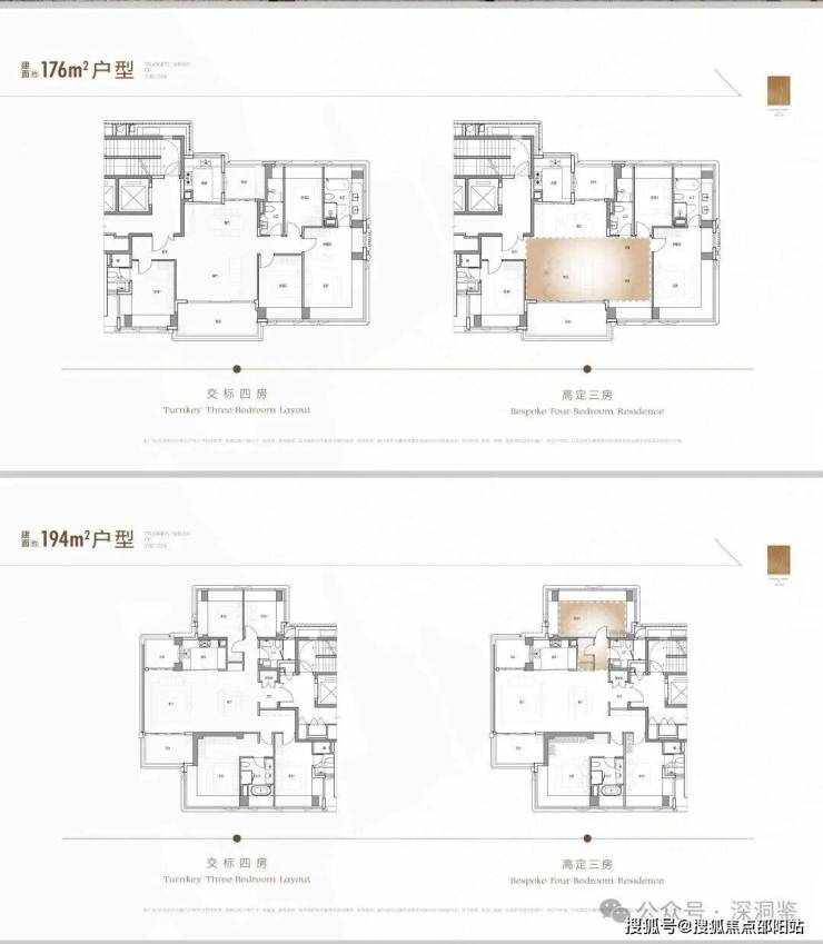 176m²、194m²,三/四房,2梯2户,纯板楼;南北通透与空间舒展。设计大面宽短进深,类似传统顶级平层豪宅的格局,舒适度高;