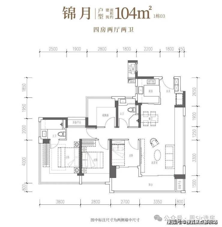 104㎡的4房2厅2卫,设计的是竖厅格局,客厅4.15米开间,LDKB一体化设计,预留冰箱卡槽位,四开间朝南,动静分区,主卧270°无柱转角飘窗还带1个设备平台约1.52平,分别做到了主卧20.34㎡/次卧11.2㎡/次卧7.7㎡/次卧6.75㎡(包含墙体飘窗),U型厨房烟道外置,卫生间干湿分离,得房率约100.71%(包含赠送),客厅连接次卧出大阳台约11.23平,西南朝向。