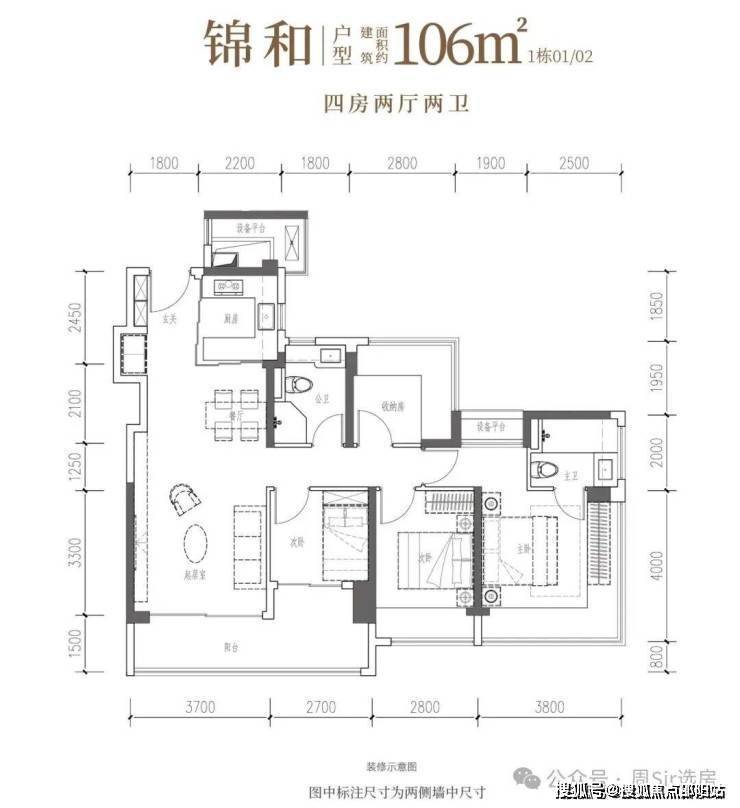 106㎡的4房2厅2卫,设计的是竖厅格局,客厅3.7米开间,LDKB一体化,S墙设计预留冰箱卡槽位,四开间朝南,动静分区,主卧270°无柱转角飘窗还带1个设备平台约1.52平,分别做到了主卧20.34㎡/次卧11.2㎡/次卧7.7㎡/次卧6.75㎡(包含墙体飘窗),U型厨房烟道外置,卫生间干湿分离,得房率约101.16%(包含赠送),客厅连接次卧出大阳台约11.76平,东南朝向。
