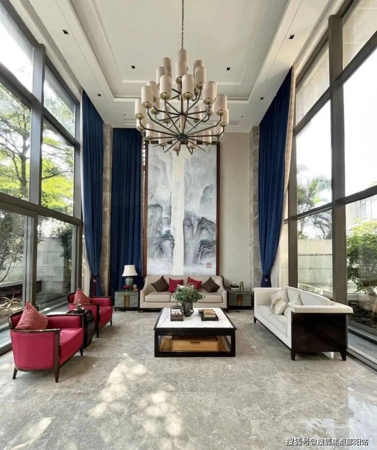 约6.9米挑高会客厅,落地玻璃的设计,在放大空间的尺度感之余,将更多白云山的自然生命力延伸进生活。室内与室外的连接与隔断、结合光影线景构筑次序空间,浪漫的表达出缓慢与轻盈的优雅生活。