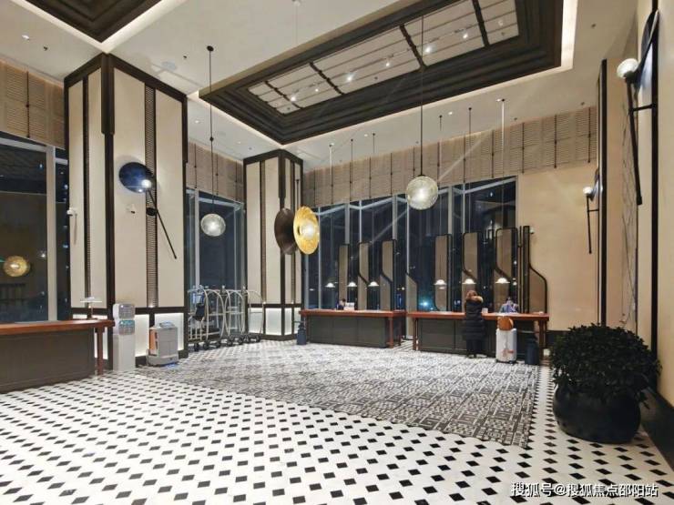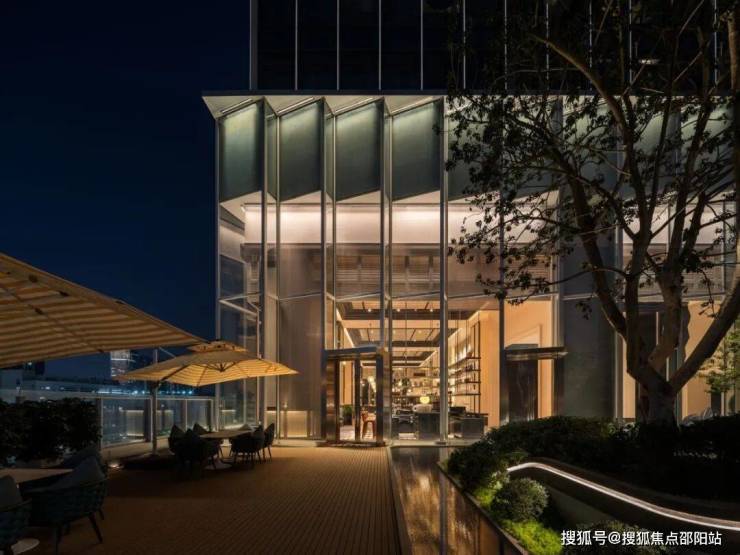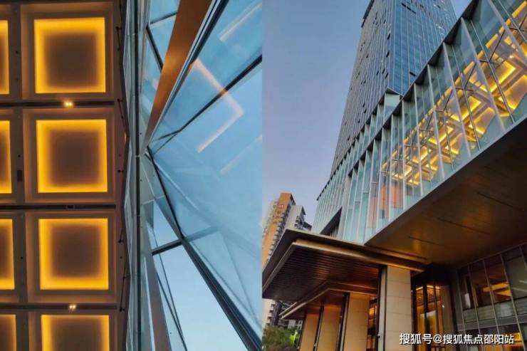 酒店低区大跨度折线玻璃幕墙是项目一大亮点,得益于此空中大堂及酒店宴会前厅拥有两层通高的空中通透视野,结合充满艺术气息的大堂吧以及露台花园带给客人非凡的入住体验,夜间两个通透的折面玻璃犹如悬浮的水晶体一般引人注目。