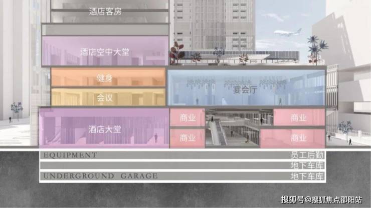 传统项目高星级酒店与商业存在一定对立关系,而本项目用地有限,无法提供足够的地表分区空间,建筑师创新的利用酒店公区抬升的巧妙设计来塑造高品质开放式商业街区,高品质的商业街区成为酒店的配套同时也提升了酒店的公区视野高度;公寓则预留与酒店流线联通可能性,将高端公寓住户纳入酒店配套的潜在长期客群,极大提升产品价值。