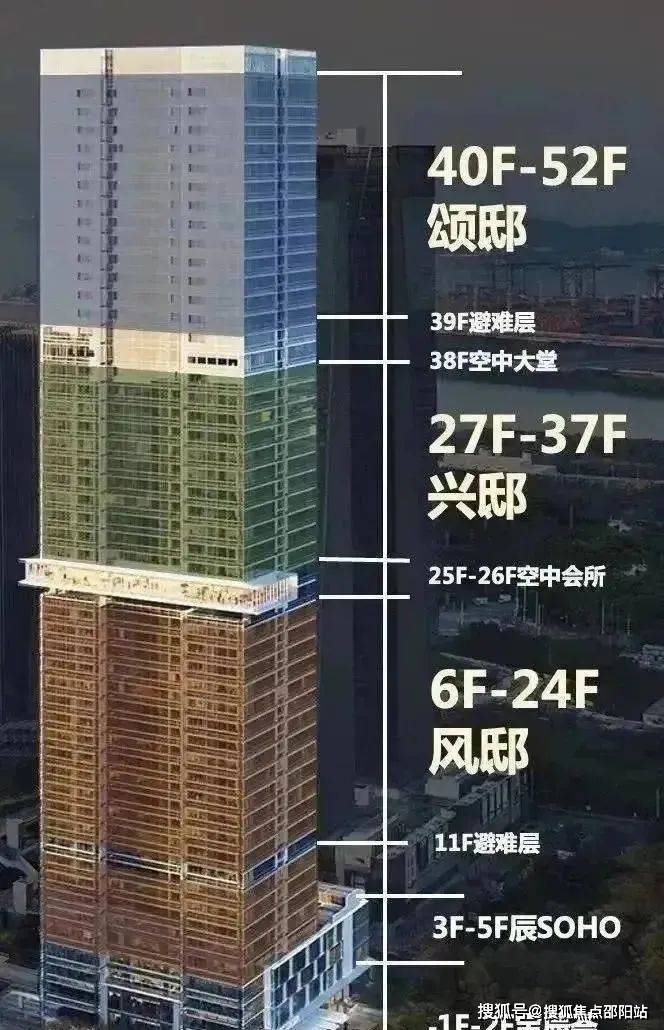 天幕藏品,总建面约8.6万㎡,主打建面约125-280㎡天幕藏品,分布在楼层的中区、高区、超高区,分别命名为风邸(6-24F)、兴邸(27-37F)和颂邸(40-52F)。
