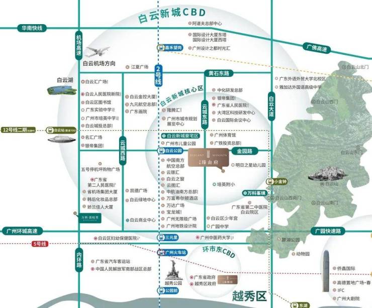交通配套:项目所在的区位很不错,位于白云新城核心区,东西两个方向都有地铁穿过,虽然不是地铁上盖,但距离白云公园站、云溪公园站、小金钟站都只需要300-600m,妥妥的地铁盘。