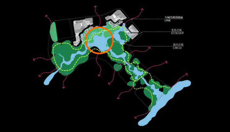 “COASIS”海岸绿洲重建公园生态,重塑公园与城市的关系。打破传统商业模式,营造立体水街商业空间,提升水街两岸商业氛围;双环动线联通,激活片区活力;建筑与环境互融,打造海岸绿洲-COASIS,引领未来商业设计潮流。