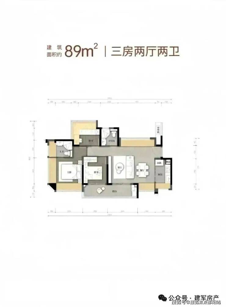 89㎡的3房2厅2卫,1栋02.03户型,设计的是经典竖厅格局,客厅3.4米开间,LDKB一体化,S墙设计预留冰箱卡槽位,动静分区,分别做到了主卧16.28㎡/次卧9.53㎡/次卧9.42㎡(包含墙体飘窗),U型厨房,卫生间干湿分离,得房率约79.6%(不含赠送),客厅连接次卧出9.45m²观景大阳台,西南朝向。套内面积70.43m²+赠送面积14.58m²=实用面积85.01m²,加上赠送面积后得房率96.1%。