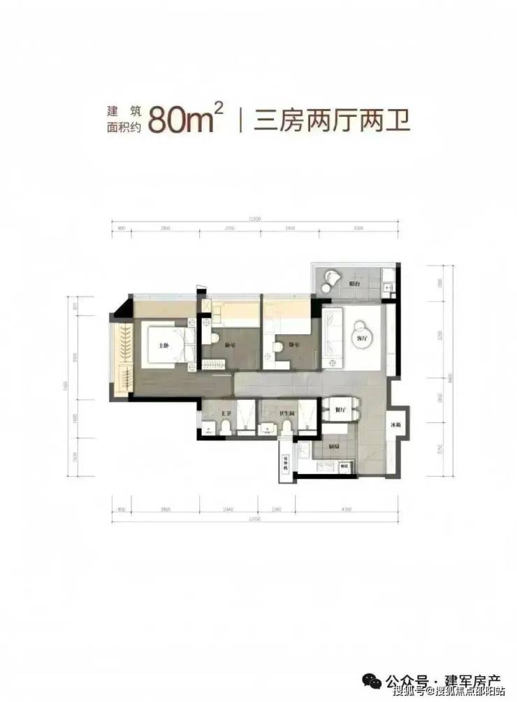 80㎡的3房2厅2卫,设计的是竖厅格局,客厅3.3米开间,LDKB一体化,S墙设计预留冰箱卡槽位,动静分区,分别做到了主卧16.38㎡/次卧8.16㎡/次卧7.84㎡(包含墙体飘窗),U型厨房,卫生间干湿分离,得房率约79.6%(不含赠送),阳台4.95m²东北朝向。套内面积63.98m²+赠送面积11.55m²=实用面积75.53m²,加上赠送面积后得房率94%。
