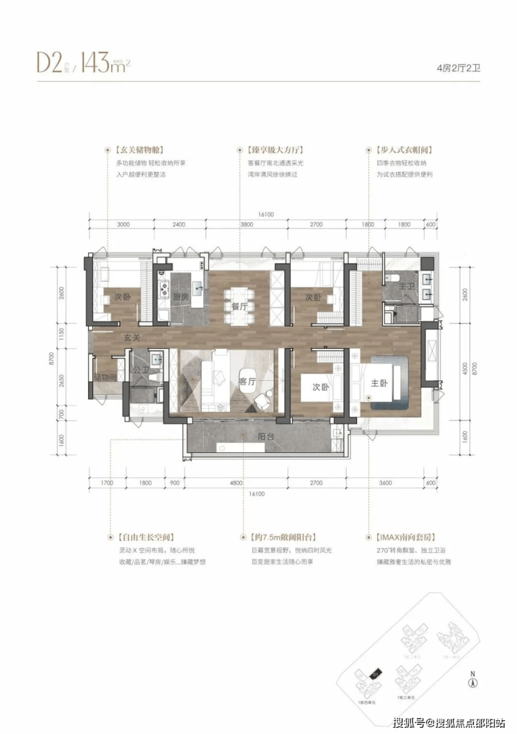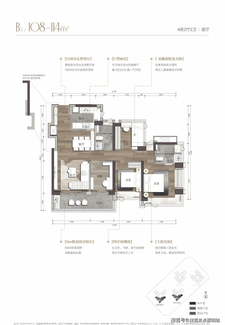 建面约108-143㎡海幕纯四房,臻藏级南向湾海视野,LDKB人性化动线设计,格局方正、高实用率,打造独立玄关、双飘窗主卧、步入式衣帽间等个性化空间。